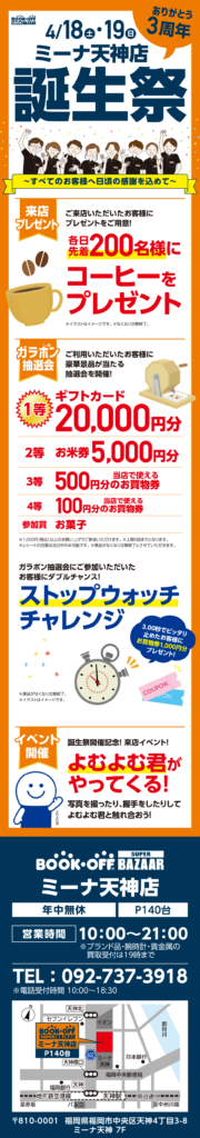 【2026/4/18~4/26開催】ブックオフ ミーナ天神店で「誕生祭」が開催!買取UPや豪華抽選会でお得に楽しむ9日間