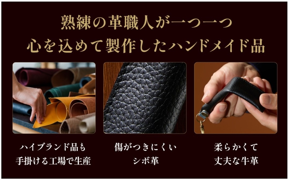 2025年2月の発売以来、累計1,500個を突破したこのアイテム。ハイブランドも手がける工場の職人が、本牛革(フローターレザー)を使用して一つひとつ丁寧にハンドメイドで製作しています。日本の専門機関で「本革」であることが証明された確かな品質が、大人にふさわしい風格を演出します。