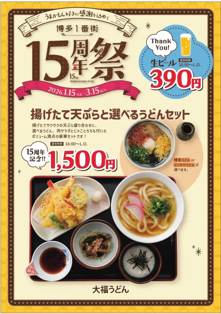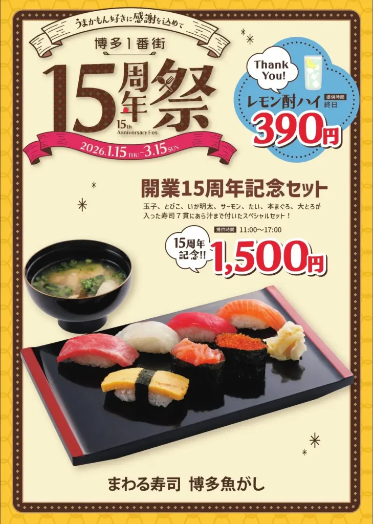 博多駅を利用する皆さんの胃袋を支えて15年。2026年3月3日に節目の年を迎える「博多1番街」で、感謝の気持ちが爆発するアニバーサリーイベントが開催されますッ!