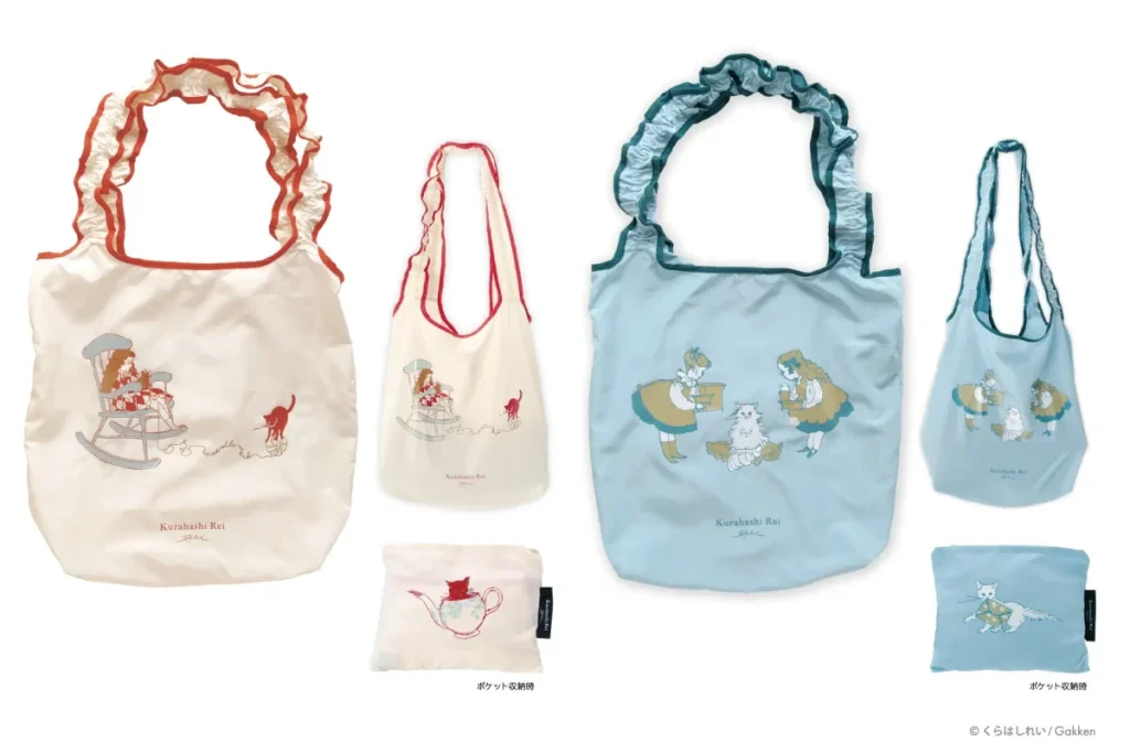• フリルエコバッグ:持ち手のフリルと猫のアートが目を引く、お出かけの主役級アイテム。内ポケットにもイラストが隠れているこだわりの仕様ですッ。