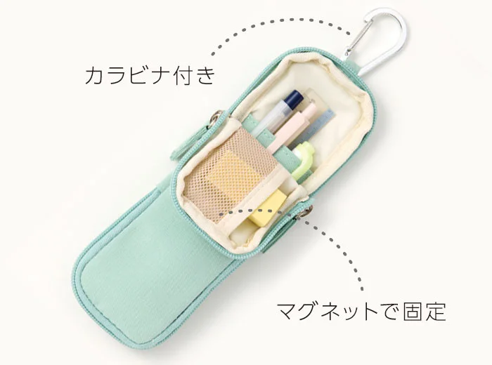 - 「半開」で省スペース:ファスナーを半分開けてフロント面を折ると、マグネットで固定され自立。狭いデスク上でも場所を取らずにペンを取り出せます 。