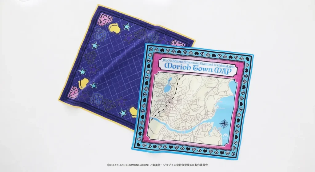 - 杜王町マップハンカチ(2,200円):物語の舞台である杜王町の地図をプリント。50cm角の大判サイズなので、ハンカチとしてだけでなく、スカーフのようにバッグに結んだり、壁に飾ってインテリアとしても楽しめます。