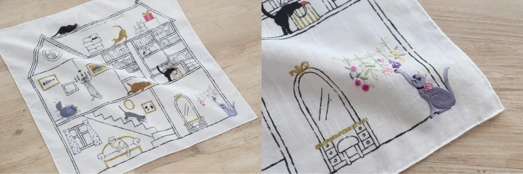 新作「キャットハウス」は、ドールハウスに見立てた家の中で思い思いに過ごす猫たちの姿が、繊細なプリントと手刺繍で描き出されています。単なるキャラクターグッズとは一線を画す、工芸品のような奥行きが魅力です。