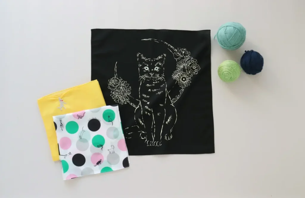 注目すべきは、右下で花と戯れる猫の姿。ここには熟練の職人による「ベトナム手刺繍」が施されており、プリントのフラットな質感の中に、刺繍ならではの立体感と温もりが宿っています。伝統技術の継承という想いも込められたこの一枚は、使うたびに指先から職人の手仕事を感じさせてくれます。