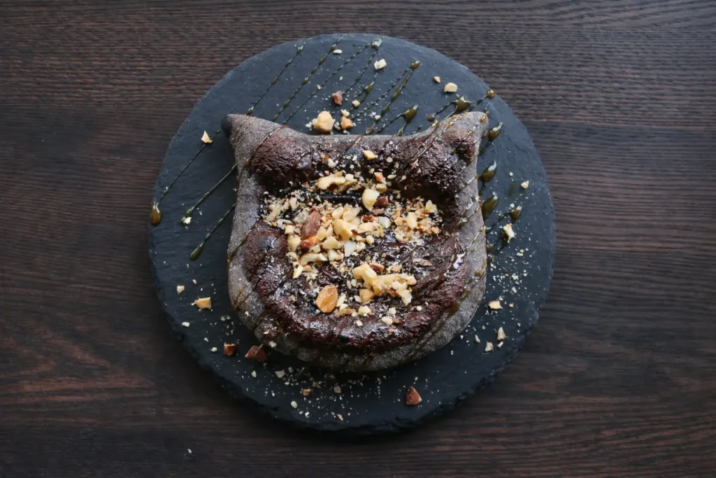 - チョコ“にゃ”ッツ:ココアを練り込み黒猫を表現した生地に、濃厚なチョコソースを。ビールとのペアリングも愉しめる、大人のためのデザートピザです。