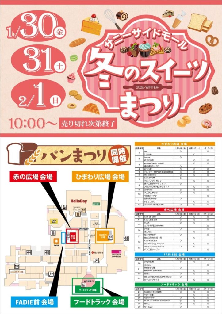 北九州市小倉南区のショッピングモール「サニーサイドモール小倉」が、甘い香りと焼きたてパンの幸せな空気に包まれます。2026年1月30日(金)から2月1日(日)までの3日間、「冬のスイーツまつり・パンまつり」が開催。地元で人気の名店から話題のショップまで、計44店舗が一堂に会する特別な週末です。