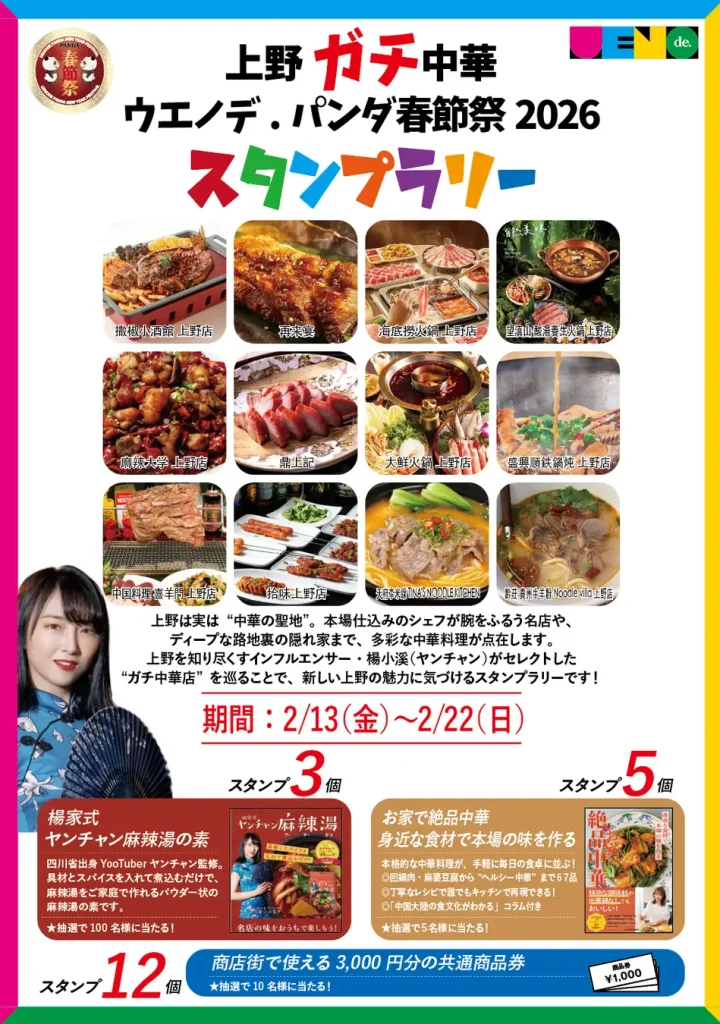 - デジタルスタンプラリー:上野エリアの「ガチ中華」店舗12箇所を巡るラリーも同時開催。スタンプ数に応じて共通商品券などが当たる抽選に応募可能です。