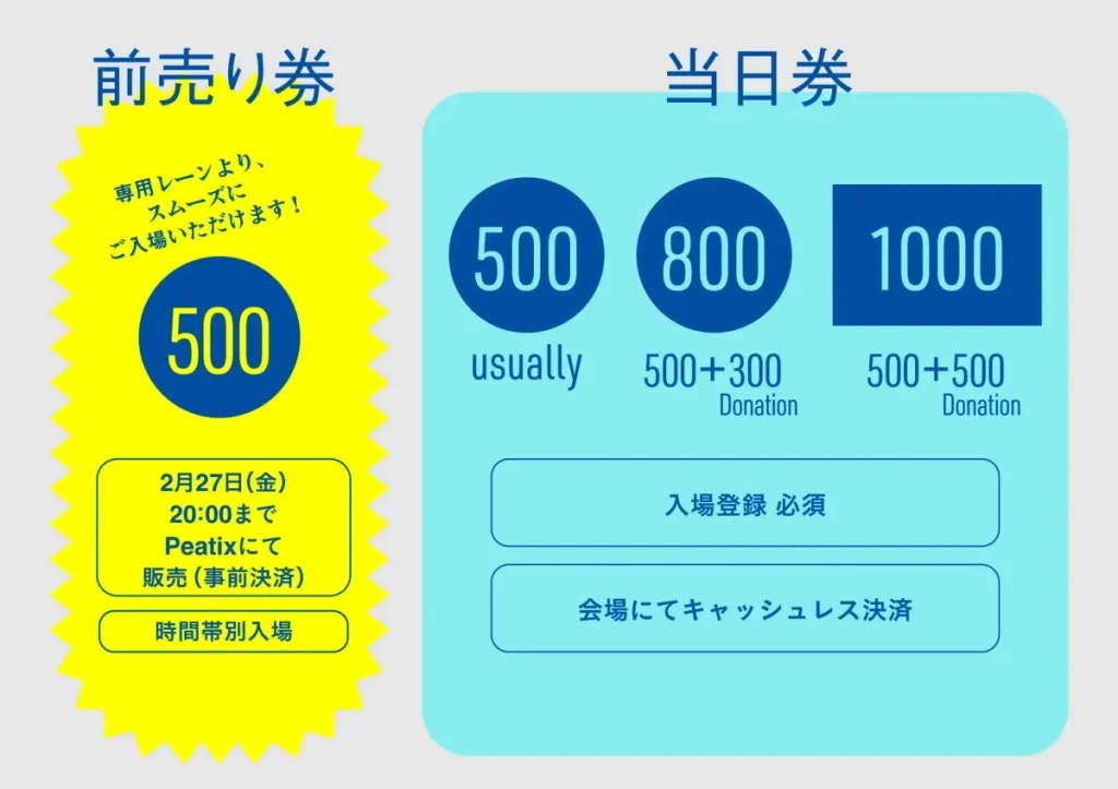 Peatixにて2026年2月27日(金)20:00まで前売り券が販売されています。当日は「前売り券専用レーン」があり、スムーズに入場できます。ワンコイン(500円)で電子決済できるため、小銭を用意する手間も省けます。