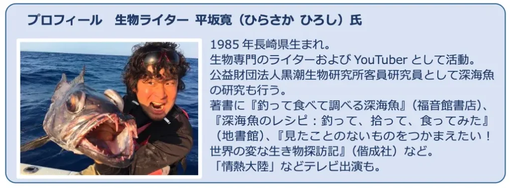 本イベントの目玉は、“五感を通じて生物を知る”をモットーに、YouTubeやメディアで絶大な人気を誇る生物ライター・平坂寛氏によるトークショーです。