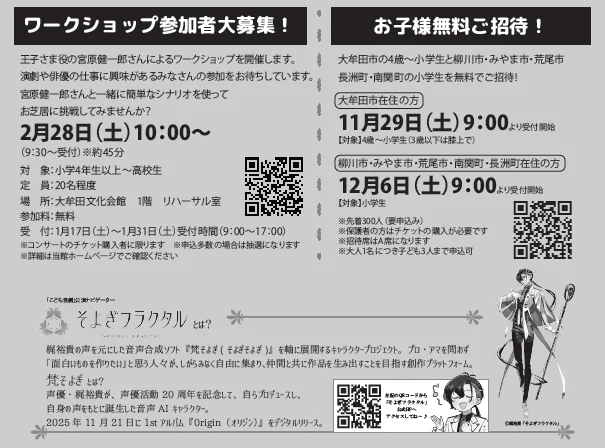 - 演劇ワークショップ: 王子さま役の宮原健一郎さんによるワークショップが10:00から開催。対象は小学4年生〜高校生のチケット購入者(先着20名・無料)。