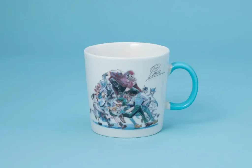 - 描き下ろしマグカップ: 先生の複製サイン入り。ターコイズの持ち手がアクセントの限定デザイン(税込2,970円)。