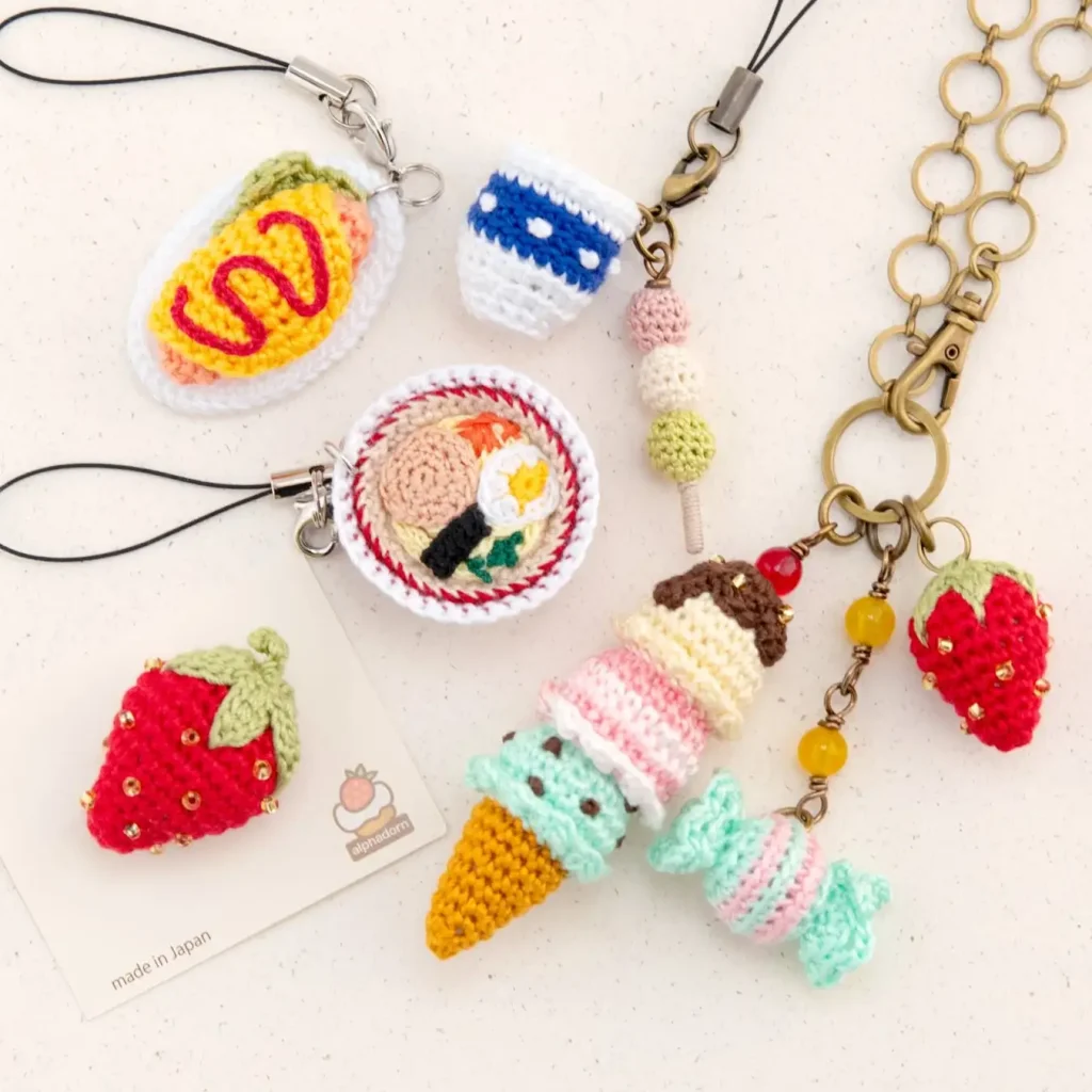 • alphadorn(アルファドーン): 神戸在住のクリエイターによる、極細レース糸で編まれた精密な「あみぐるみスイーツ」のアクセサリー。