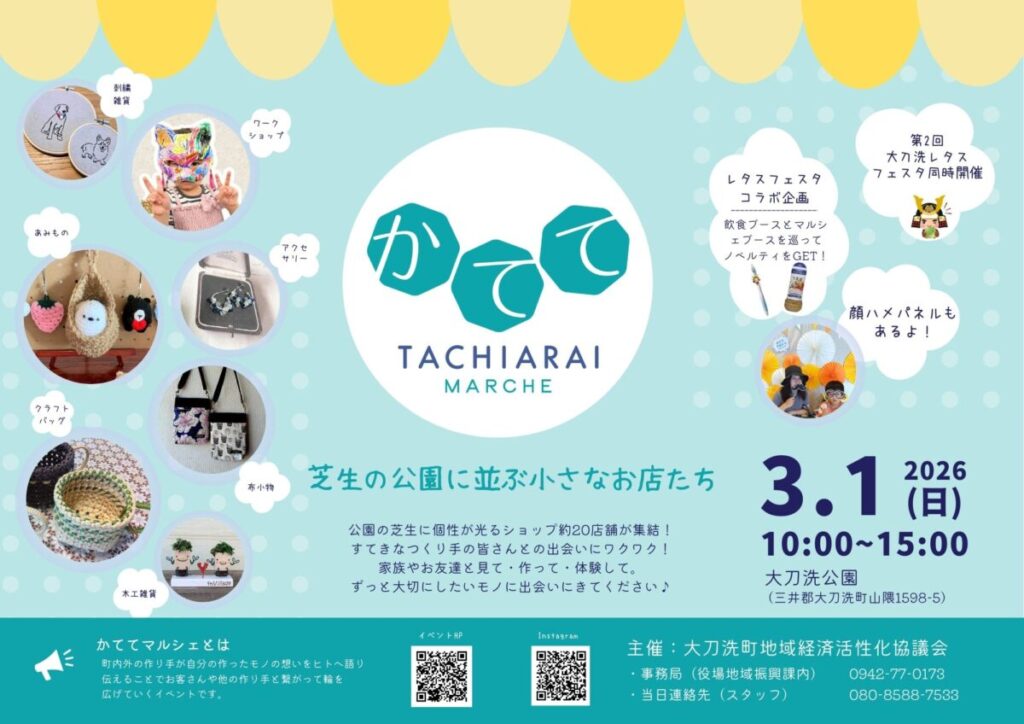 福岡県大刀洗町が誇る特産品を主役にした一大イベント『第2回大刀洗レタスフェスタ ~レタス×グルメ×音楽~』と、町内外のクリエイターが集結する大人気企画『第8回かててマルシェ』が、2026年3月1日(日)に大刀洗公園(芝生エリア)にて同時開催されます!