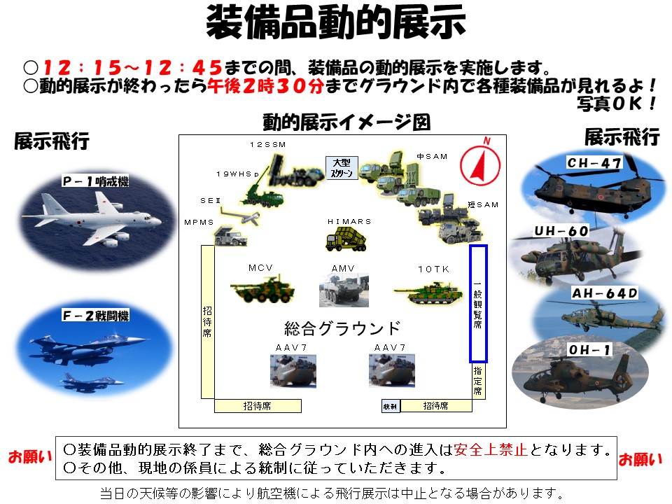 - 12:15~12:45:装備品の動的展示(グラウンド)