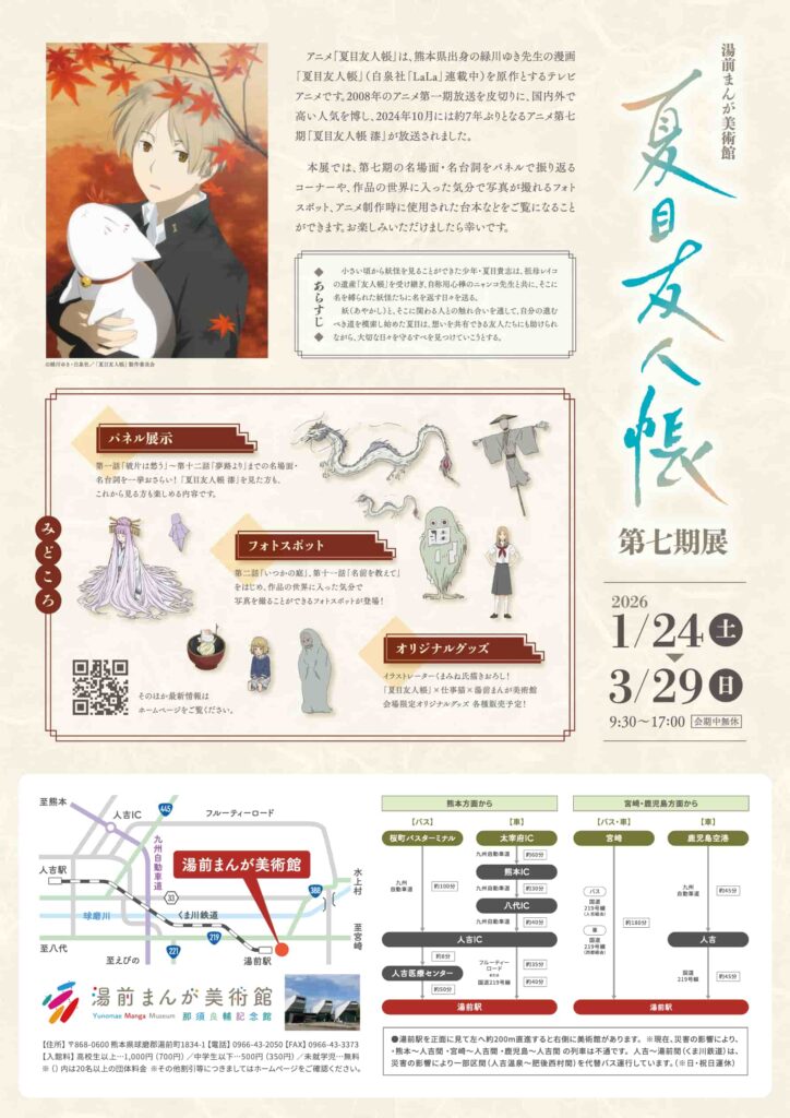 2024年10月に約7年ぶりの放送となった第七期「夏目友人帳 漆」の世界を、じっくりと堪能できる展示となっています。会場となる湯前まんが美術館の所在地は、熊本県球磨郡湯前町1834-1です。