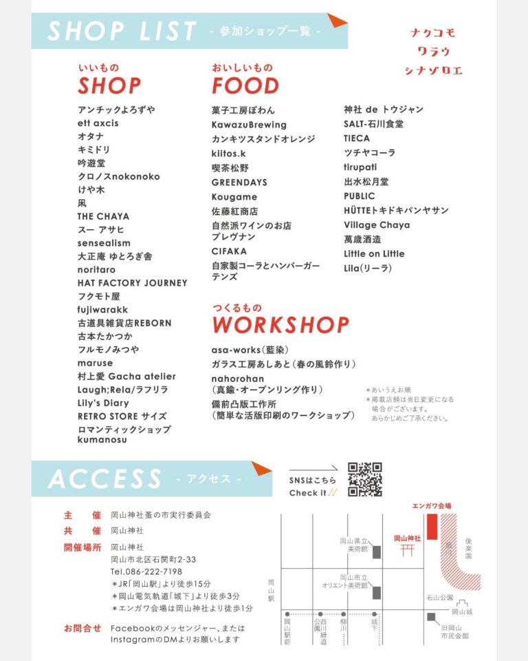 朝8時からの開催です。爽やかな朝の空気の中、岡山神社の境内と徒歩1分の「エンガワ会場」を巡りながら、一期一会の出会いをお愉しみください。