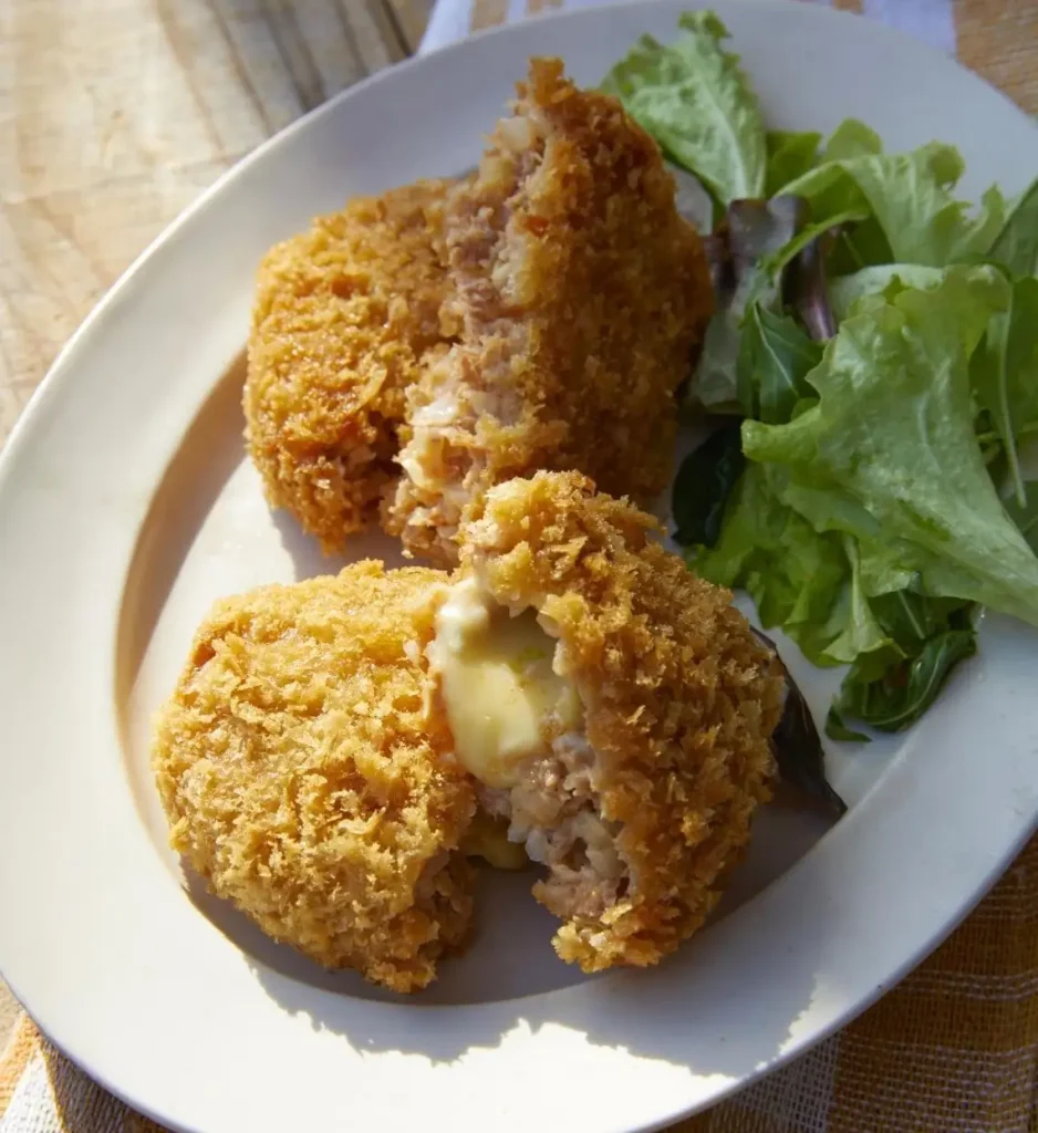 ・観音池ポーク:ブランド豚の旨味が溢れ出す「チーズメンチカツ」は食べ歩きにも。