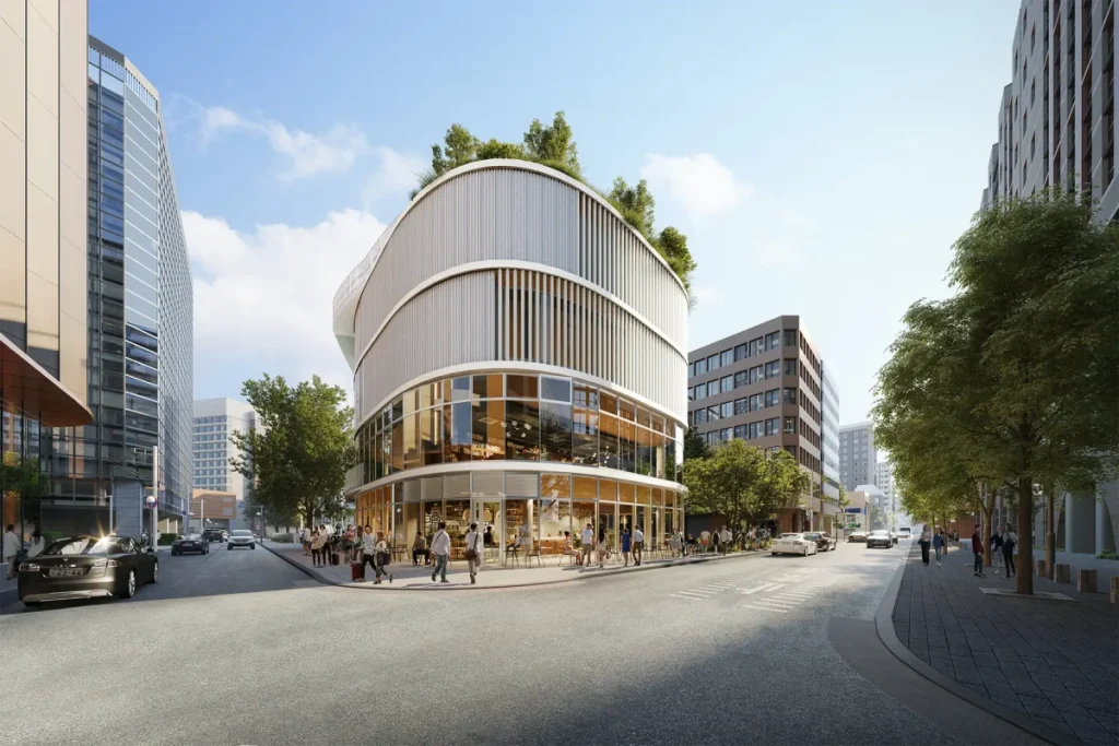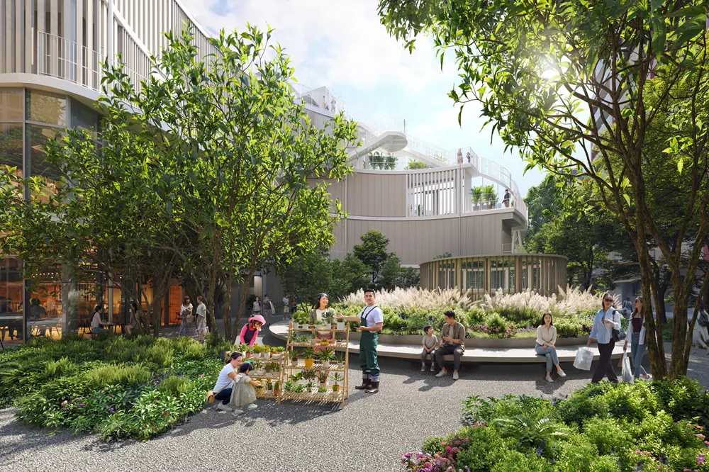 4階建ての店舗棟:デザイン監修に藤本壮介建築設計事務所を迎え、飲食・運動施設(温浴施設等)を含む計7店舗が入居予定。テラスや、誰もが自由に利用できる「屋上広場」も備わります。