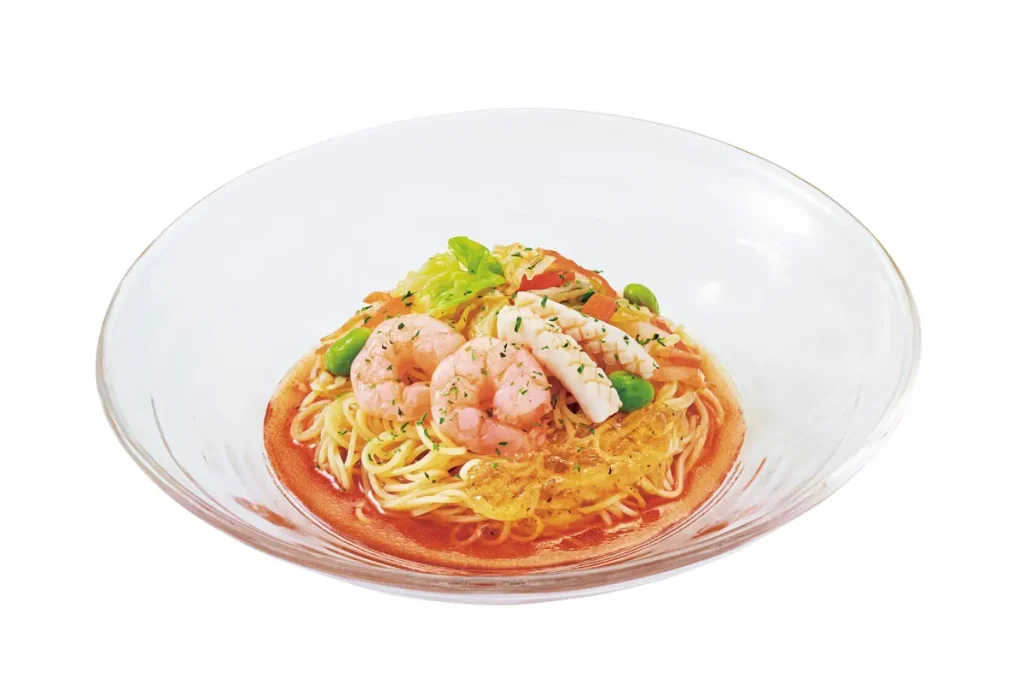 • トマト海鮮野菜涼風麺 レモンジュレ添え:洋風のトマトレモンスープに、レモン酢ジュレがキラキラと輝く華やかな一品。(682円)