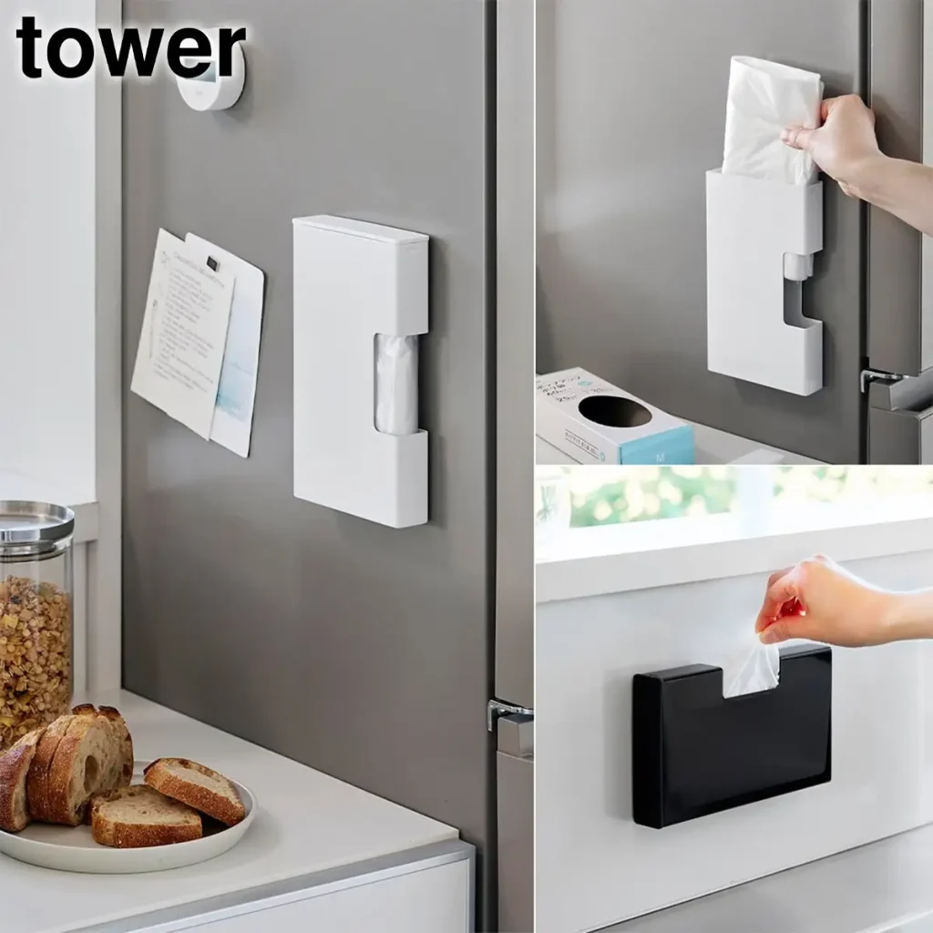 冷蔵庫横やキッチンパネルにペタッと貼れる、スリムなポリ袋ホルダーです。縦・横どちらの向きでも設置できるため、キッチンの隙間に合わせてカスタマイズが可能。蓋を開けて入れるだけで補充も簡単なので、調理中の「あと一枚!」がノンストレスになります。
