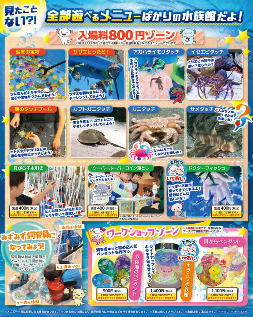• 館内お買上げ特典:当日、リバーウォーク北九州館内での500円以上のお買い上げレシート提示で、「ウーパールーパー コイン落とし」のコインを、お子さまの人数分プレゼント(1家族1回限り)。