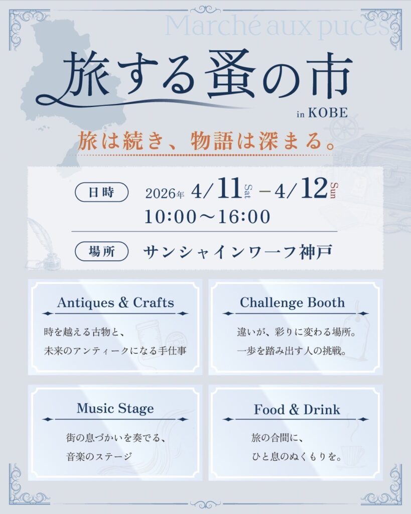 【2026/4/11・12開催】神戸の海辺で「旅する蚤の市 in KOBE」!サンシャインワーフ神戸で運命の宝探しを
