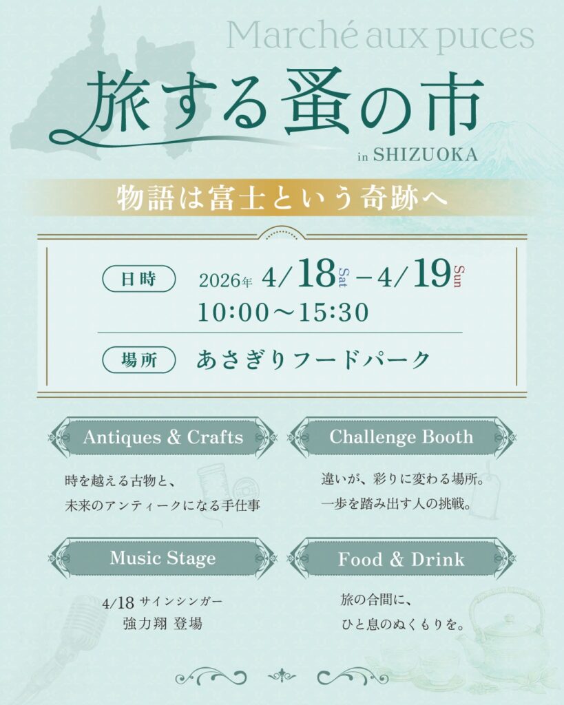 【2026/4/18・19開催】富士の麓で「旅する蚤の市 in SHIZUOKA」!朝霧の澄んだ空気の中で運命の宝探しを
