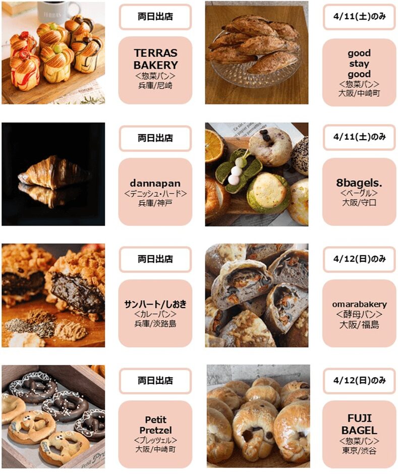 今回のパンフェスでは、地元大阪の実力派から東京の有名店まで、パン職人のこだわりが詰まった自慢の品々が勢揃いします。デニッシュ、カレーパン、ベーグル、惣菜パンなど、ジャンル豊かなラインナップは、選ぶ楽しさと新しい食の発見を届けてくれます。