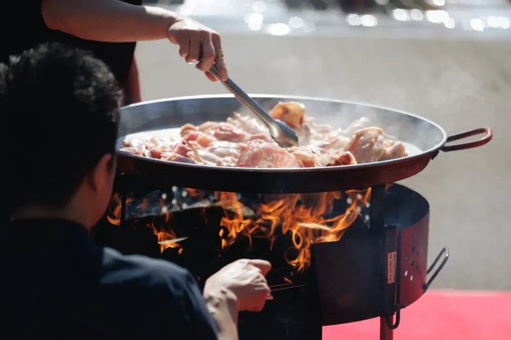 パエリアの起源を巡る戦い「バレンシアーナパエリア ジャパンコンクール」では、本場同様に薪火(まきび)を用いて、鶏肉と兎肉を使用した本格パエリアが炊き上げられます。横一列に並んだパエリアパンから立ち昇る香ばしい煙と熱気は、まさに圧巻の一言。日本パエリア協会の会員限定(当日入会可)で、全エントリー店舗の食べ比べセットも販売されます。