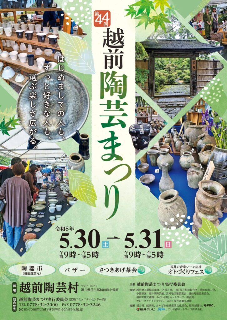 新緑がまぶしい季節、福井県が誇る伝統工芸「越前焼」の魅力を五感で楽しめる、県内最大級の陶器市が今年もやってきます!2026年5月30日(土)・31日(日)の2日間、越前陶芸村にて『第44回越前陶芸まつり』が開催されます。