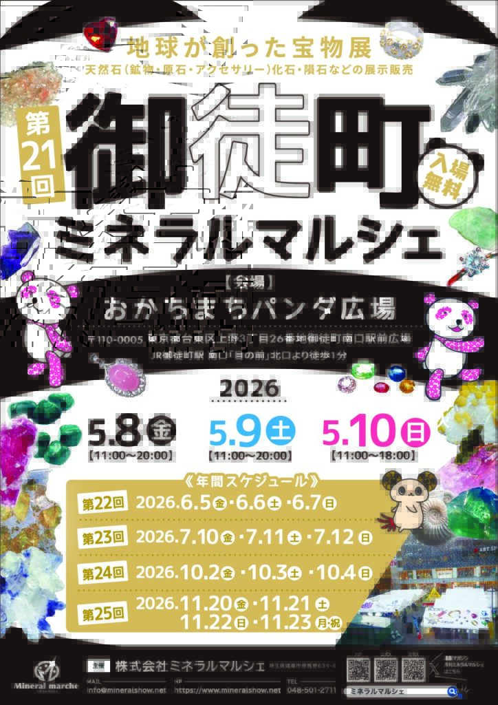 2026年5月8日(金)から10日(日)の3日間、JR御徒町駅南口すぐの「おかちまちパンダ広場」にて、『第21回御徒町ミネラルマルシェ May』が開催されます。