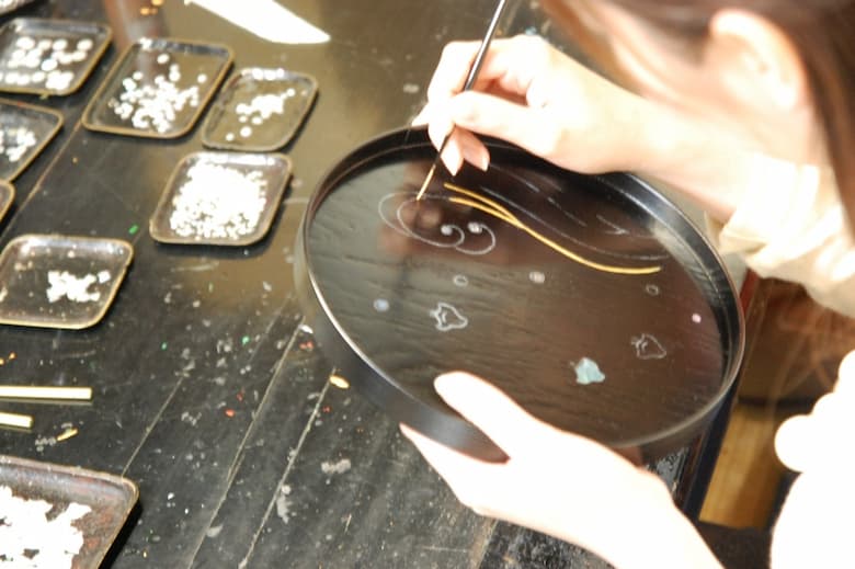 正倉院宝物に多用される「螺鈿」の技法を体験。丸盆またはコースターに絵付けを行います。