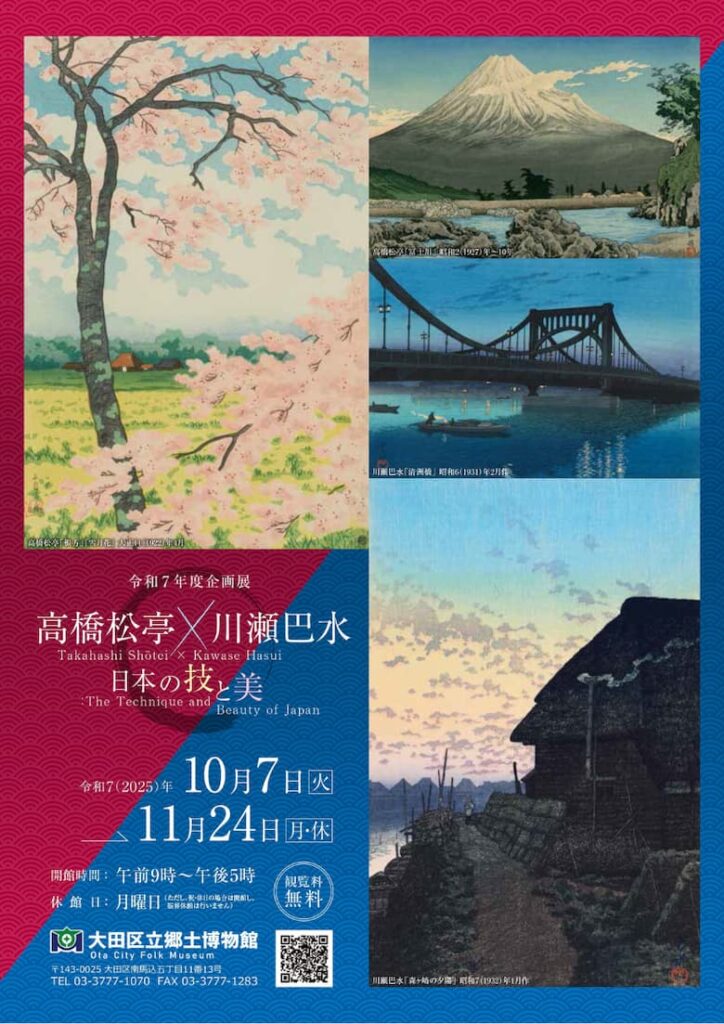 2025年10月7日(火)から11月24日(月・休)まで、東京都大田区の「大田区立郷土博物館」にて、高橋松亭の没後80年を記念した企画展「高橋松亭×川瀬巴水―日本の技と美―」が開催されます。大田区にゆかりのある二人の絵師の風景版画を比較展示。観覧は無料です。 -
