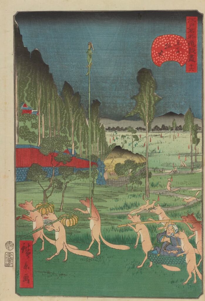 大晦日の夜、関東中の狐が王子稲荷神社近くの榎(えのき)の木に集まり、装束を整え行列をなして参詣する。その道中で灯す狐火(きつねび)の数や揺らぎの様子で、翌年の農作物の豊凶を占った、という江戸時代から伝わる有名な伝説です。