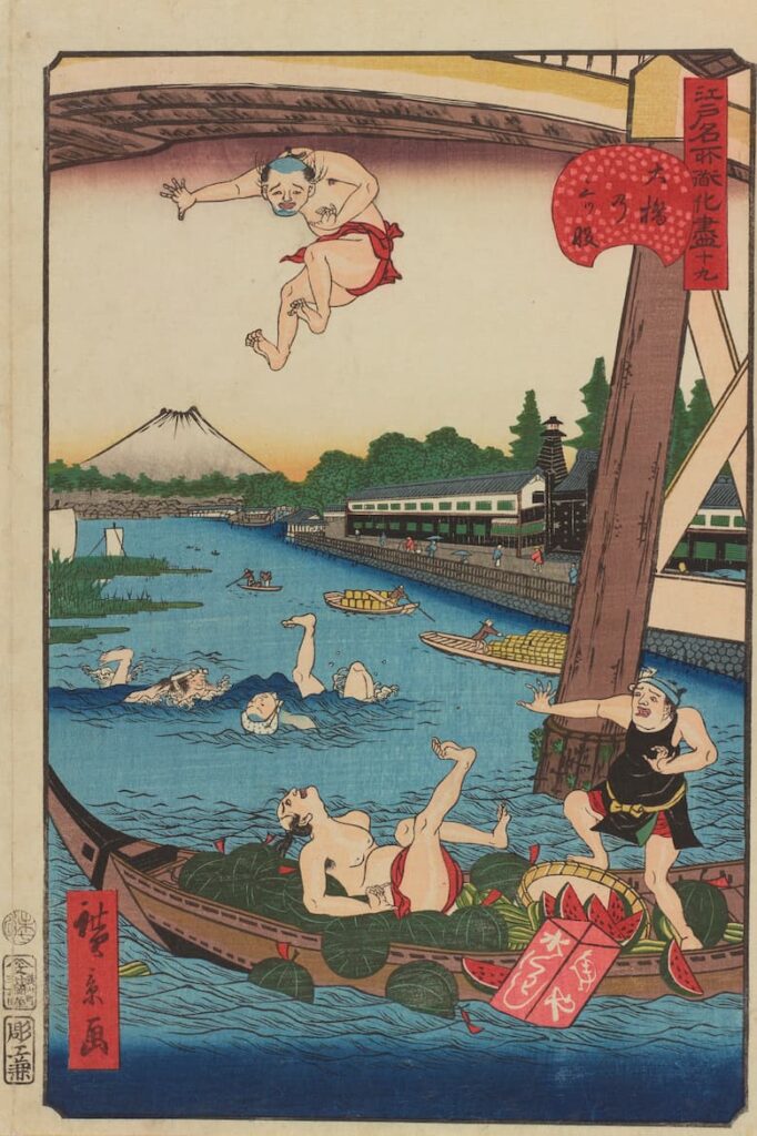 第三に、『美しい江戸名所』という期待に対し、『滑稽な日常』という裏切りを提供することで、強い印象(インパクト)を残すことだ。