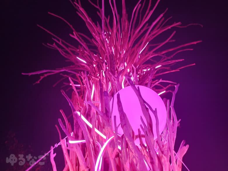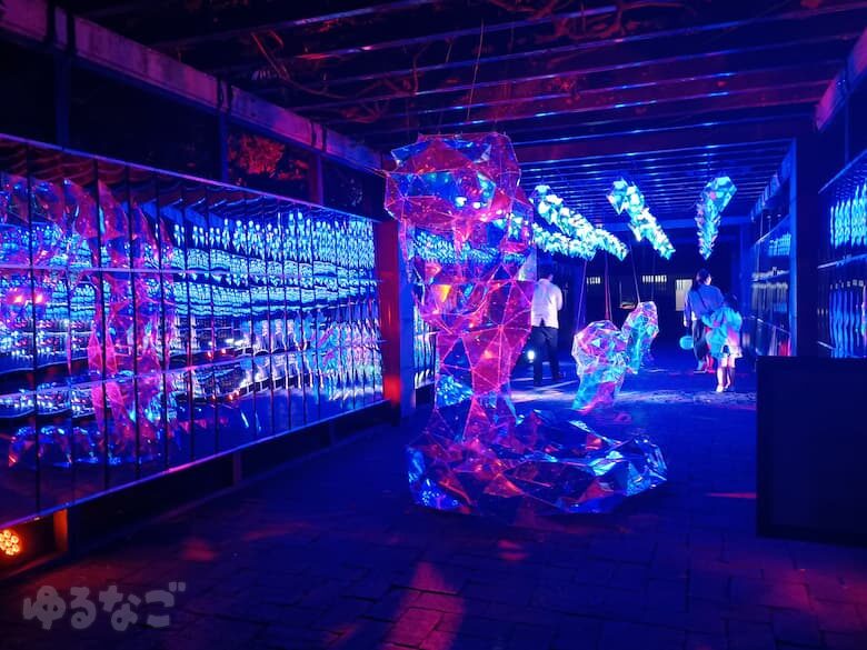 - 桜園-藤棚|無限空間と干支のオブジェ: 藤棚に設置された合わせ鏡で無限に広がる幻想的な空間。2025年の干支・大蛇のオブジェも登場します。