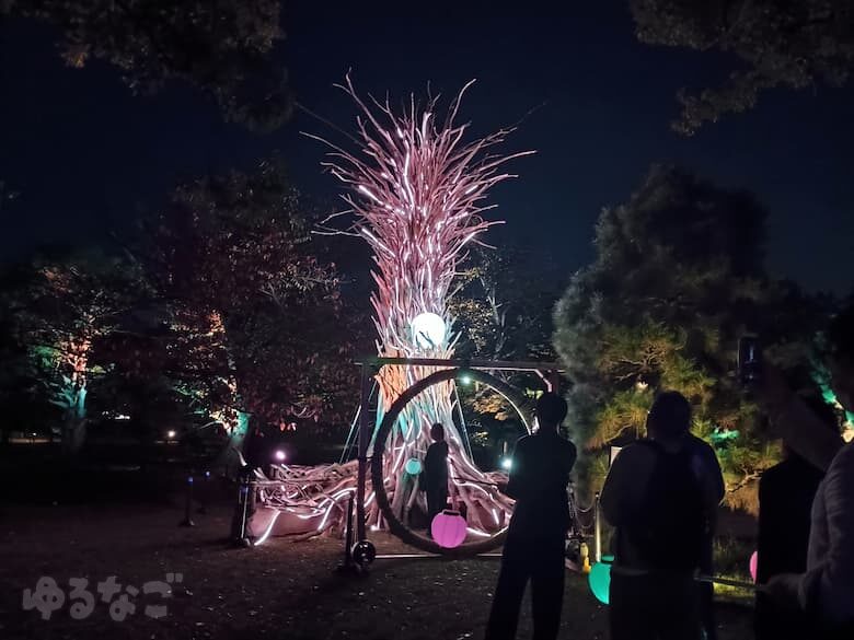 - 桜園|呼応する御神木: 桜園の中心にある御神木へ、入口で配布される提灯をかざすと光のエネルギーが広がり、桜園全体のライトアップと連動する参加型演出が楽しめます。