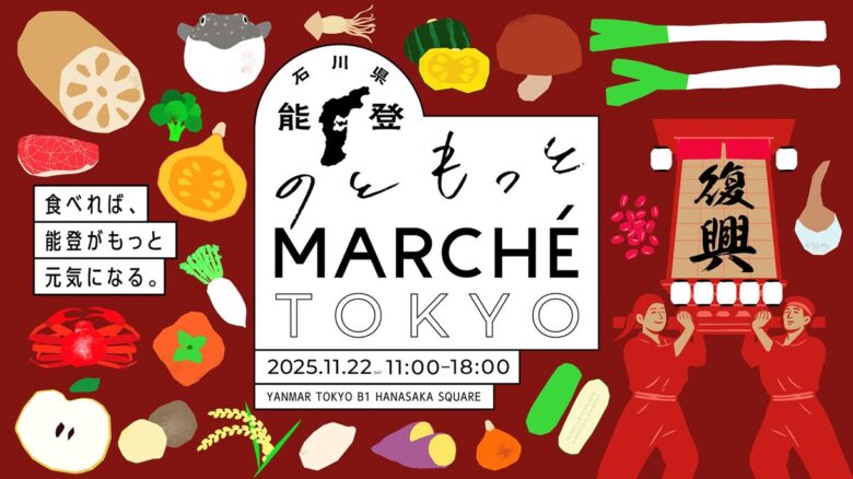 能登地域の復興支援のため、石川県の生産者が集結する「のともっと MARCHE TOKYO」が、2025年11月22日(土)に東京・八重洲のYANMAR TOKYO 地下1階 HANASAKA SQUAREにて開催されます。