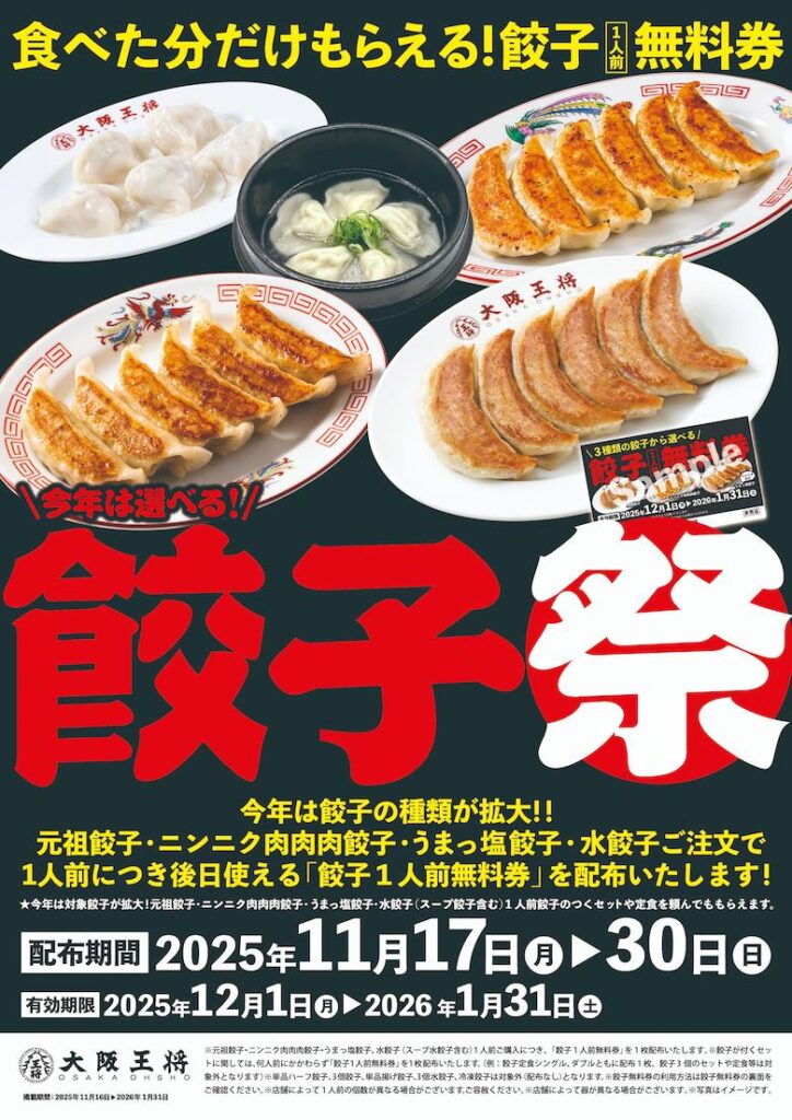 餃子専門店「大阪王将」は、2025年11月17日(月)から11月30日(日)までの期間限定で、毎年恒例の「餃子祭」を開催します。