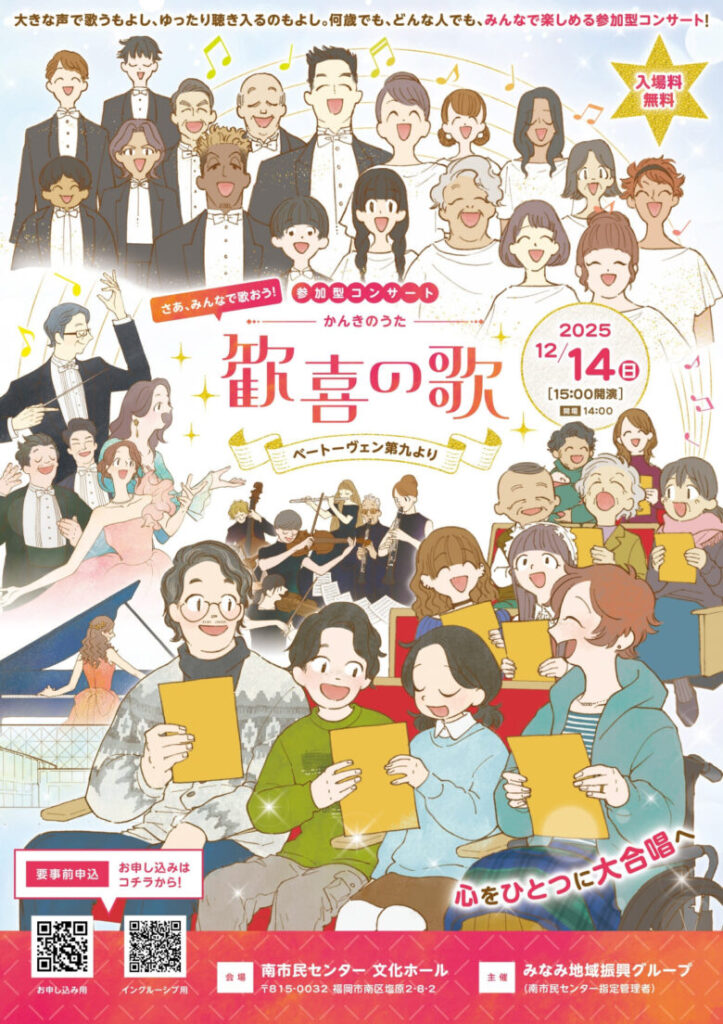 ベートーヴェンの屈指の名曲「第九」を通じ、音楽の喜びを体験できる参加型コンサート『さあ、みんなで歌おう!「歓喜の歌」~ベートーヴェン第九より~』が、2025年12月14日(日)に福岡市立南市民センターで開催されます。