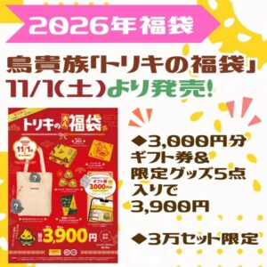 【鳥貴族】初の福袋「トリキの福袋」が11/1(土)より発売決定!3,000円分ギフト券&限定グッズ5点入りで3,900円、3万セット限定