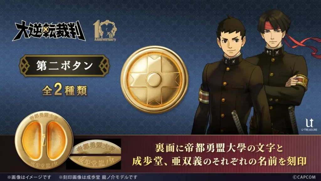 「大逆転裁判」シリーズ10周年を記念し、成歩堂龍ノ介と亜双義一真が通った「帝都勇盟大學」の学生服ボタンが本格ジュエリーとして登場!ジュエリー職人が丁寧に再現した「第二ボタン」は、裏面に名前の刻印入り。1月7日から2月16日までの期間限定予約で、一生の宝物になる豪華な記念品を手に入れるチャンスです。 -