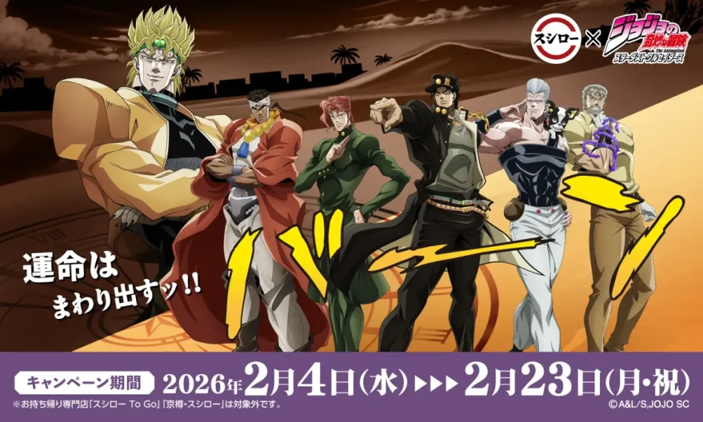 【2/4〜開始】スシロー×ジョジョ第3部が初コラボ。限定アクスタ付きメニューや「イギー等身大パネル」抽選など盛り沢山