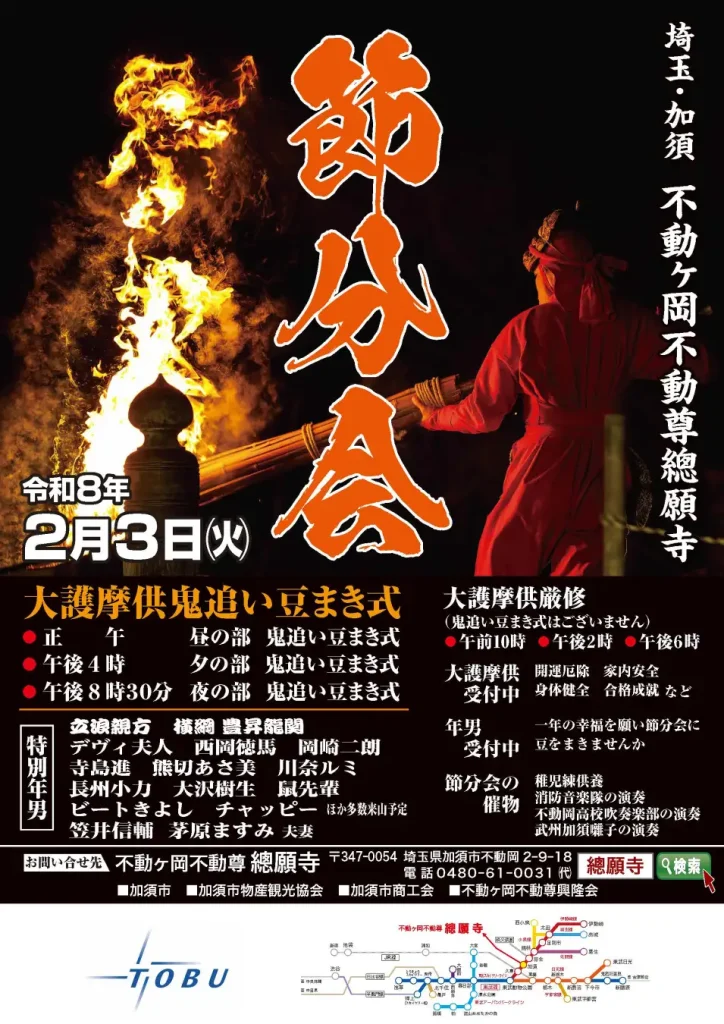 【2026年2月3日開催】加須市・總願寺「節分会 鬼追い豆撒き式」デヴィ夫人や横綱も来山!迫力の火の粉と混雑・駐車場ガイド