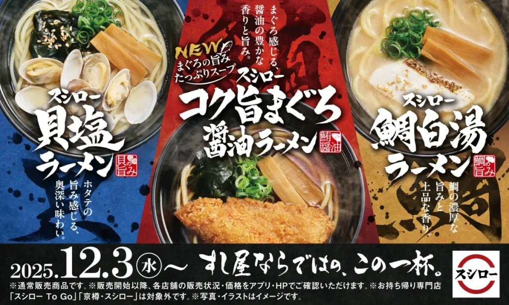 スシローの「すし屋のラーメン」シリーズが12月3日よりリニューアル。定番「コク旨まぐろ醤油ラーメン」はまぐろカツをトッピングし進化。さらに新作として「貝塩ラーメン」「鯛白湯ラーメン」が登場。寿司に合う魚介出汁を極めた一杯です。 -