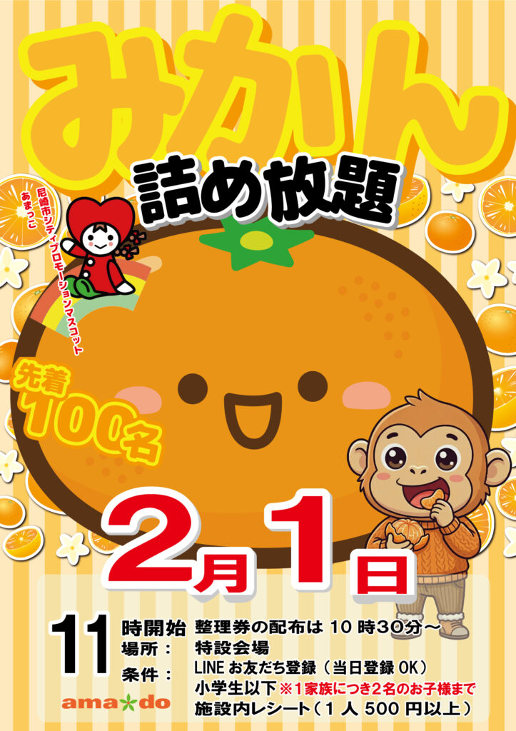 【尼崎】アマドゥで「みかん詰め放題」2/1開催!あまっこ登場&小学生以下先着100名