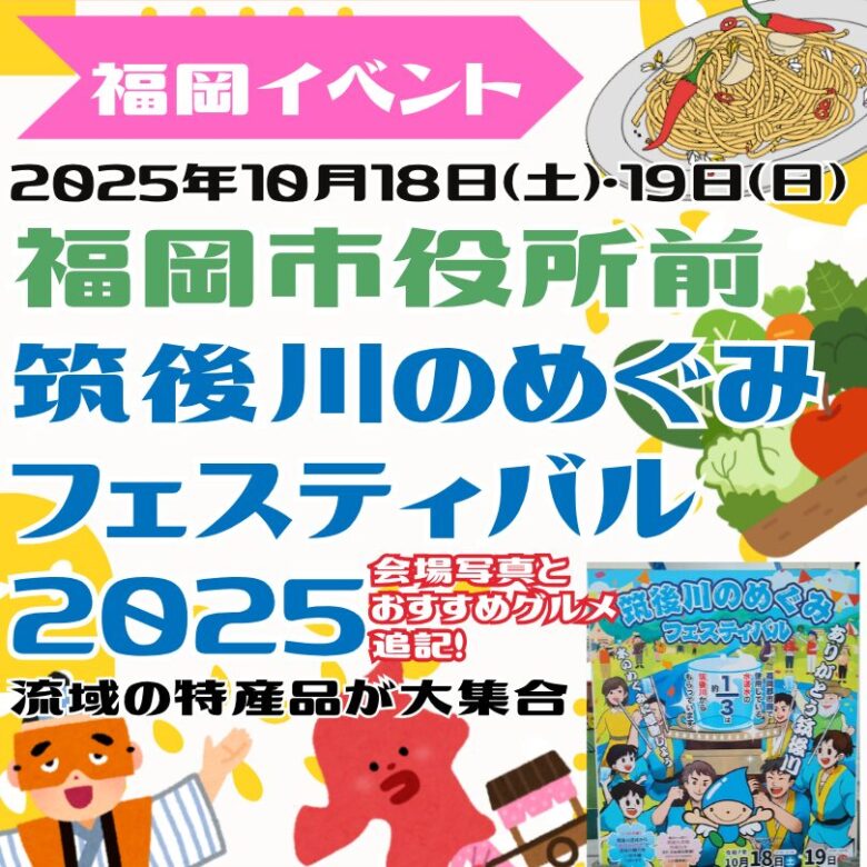 2025年10月18日(土)・19日(日)、福岡市役所西側ふれあい広場で「筑後川のめぐみフェスティバル2025」が開催されます。筑後川流域の市町村から特産品が集結するほか、伝統芸能などのステージイベントも。入場は無料です。 -