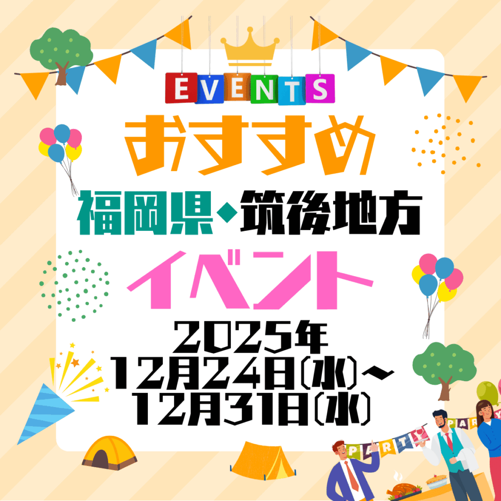 この記事では、2025年12月24日(水)~12月31日(水)に開催される筑後地方(※)の注目のイベントをピックアップしてご紹介します。 ※大牟田市、久留米市、柳川市、八女市、筑後市、大川市、小郡市、うきは市、みやま市、三井郡(大刀洗町)、三潴郡(大木町)、... -