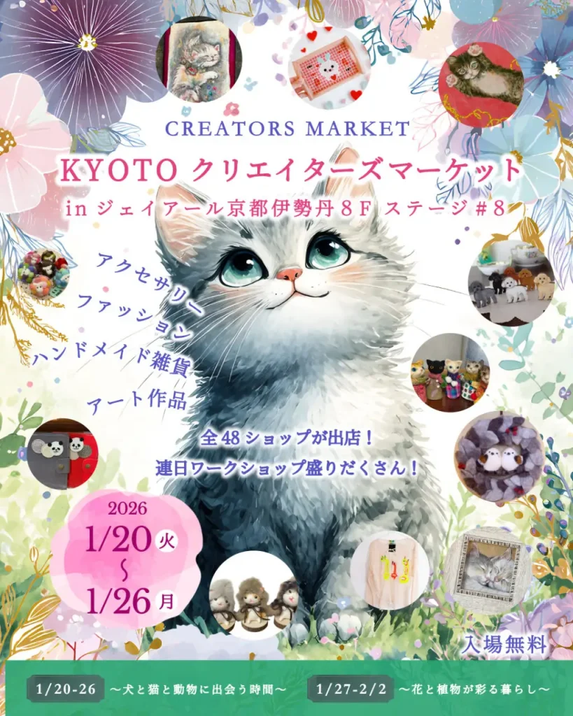 ジェイアール京都伊勢丹にて「KYOTOクリエイターズマーケット2026」が開催!1月20日からの2週間、総勢48名のクリエイターによるアクセサリーや雑貨、原画の展示販売を実施。週替わりのテーマ展示やバレンタインギフト、連日開催のワークショップなど、京都の冬を彩るクリエイティブな祭典を楽しもう。 -