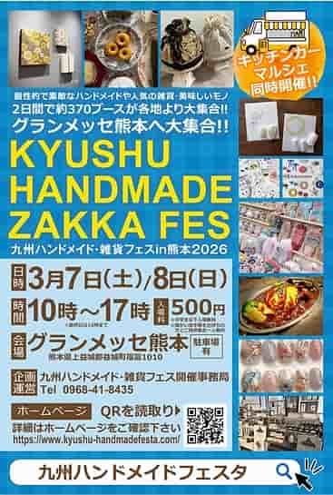 九州最大級の「九州ハンドメイド・雑貨フェス」がグランメッセ熊本で3月7日・8日に開催!アクセサリーやバッグなど370のハンドメイドSHOPが集結するほか、人気雑貨店の出店やキッチンカーマルシェも。春のプレゼント探しやワークショップを楽しもう。 -